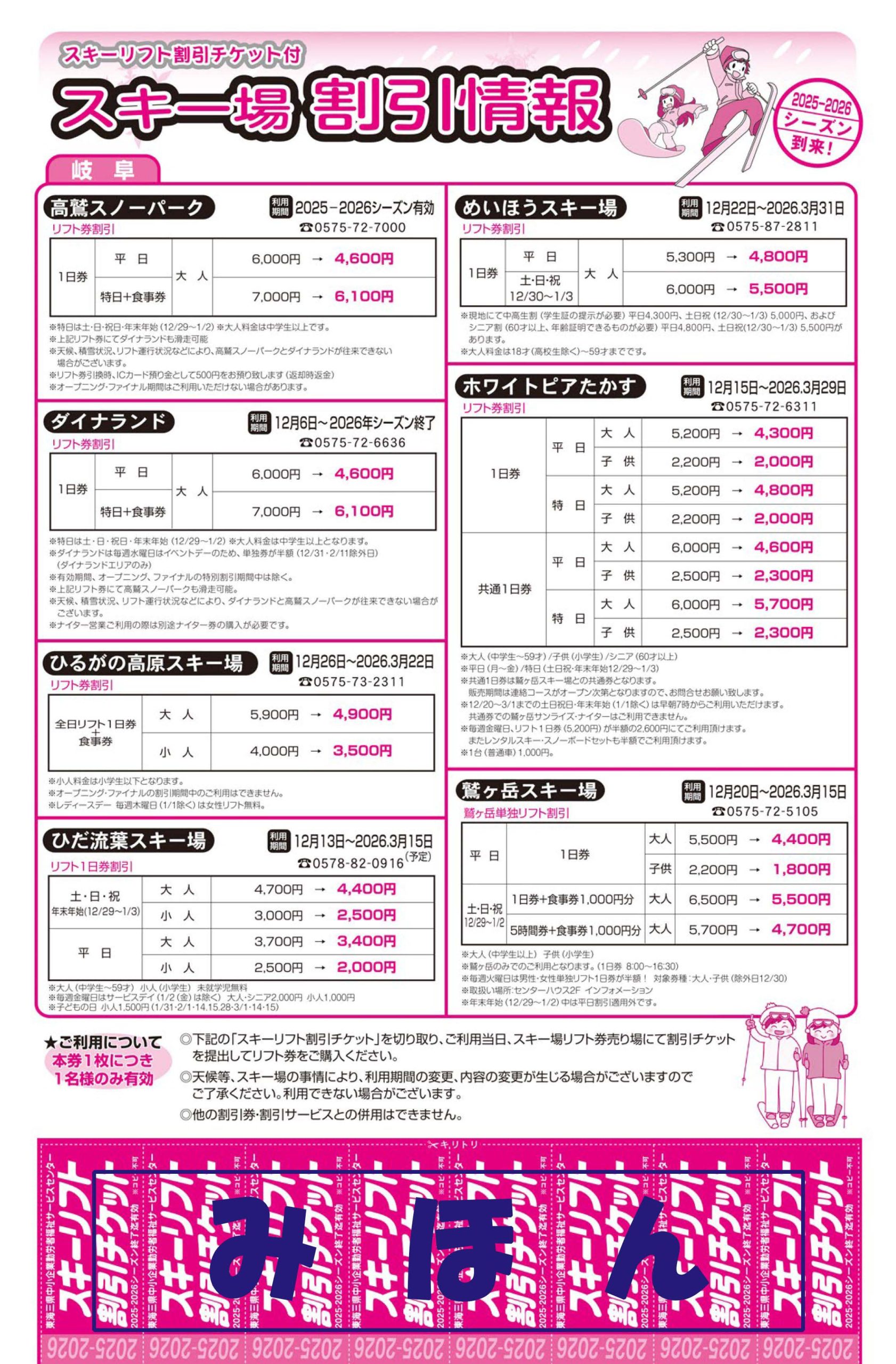 わーくりぃニュース2025年12月2026年1月合併号「スキーリフト割引チケット」を切り取り、ご利用当日、スキー場リフト券売り場にて割引チケットを提出してリフト券をご購入ください。