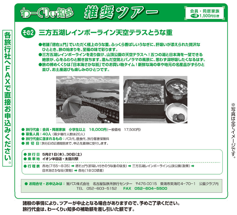 | 締切日 | 旅行日の2週間前まで、申込先着順に受付します。 |